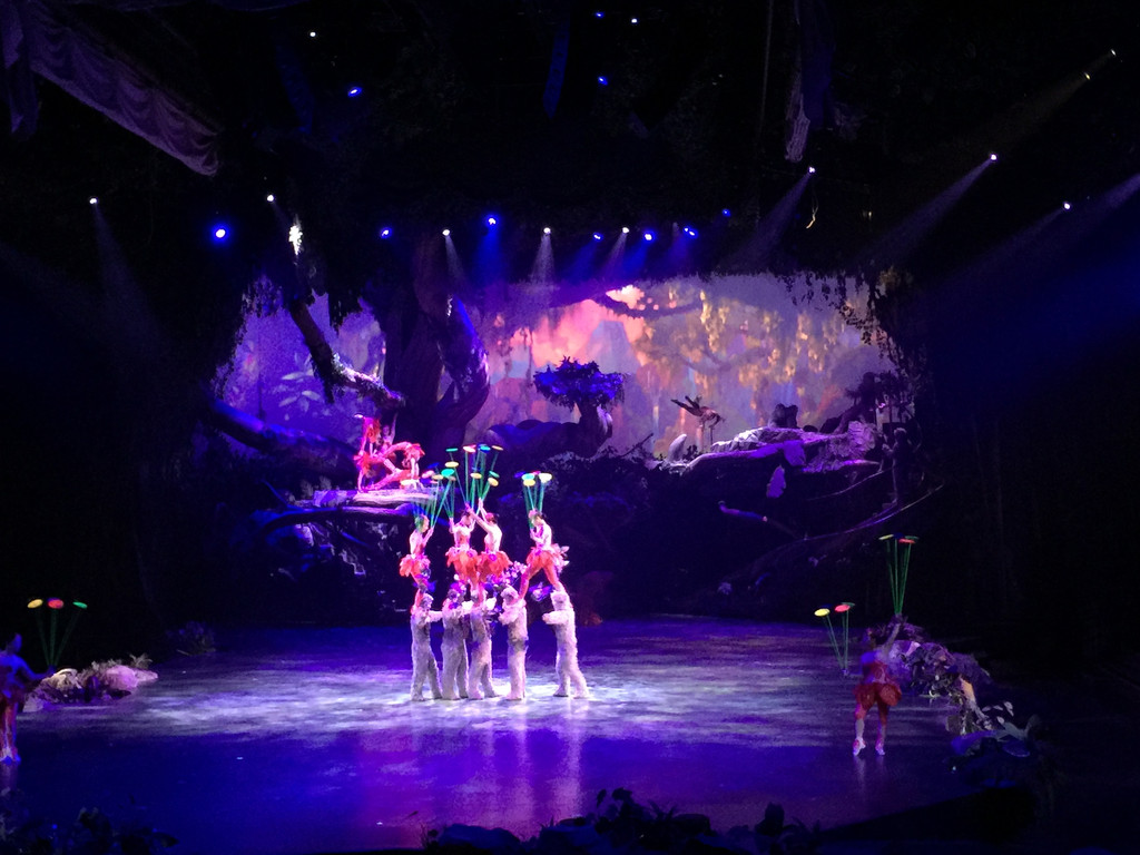 人猿泰山故事我不用重复,很多人都知道。剧场可以容纳的观众挺多,一开始用电影的形式讲述了泰山是如何到猿群中生活的。然后幕布拉开,用杂技的形式演绎着泰山长大后在丛林中的生活、遇到了探险队的珍妮、父亲死后如何担当大任领导猿群的。(如果要坐的靠前一些,建议提前20分钟去排队)