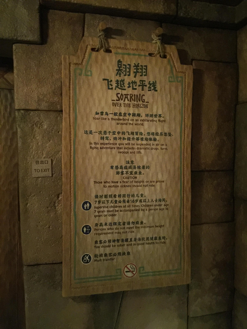 吸取第一次玩的经验,手机准备好,其他东西都放入座位下面的篮筐中。坐上一把椅子,系上安全带,我们都飞起来了,一下到达云层里,飞过乞力马扎罗山,雪山的山顶真实得让我们屏住呼吸,左躲右闪,接着就急速向雪山方向坠落。虽然事先知道是球幕电影,但是失重感仍是如此强烈,我感觉我有恐高症哦。跟着我们又飞过非洲草原、草原上动物在奔跑,掀起阵阵青草的香味;悉尼歌剧院、泰姬陵、埃菲尔铁塔、斐济的海滩、德国天鹅堡等地,碰到了触手可及的大象、水上飞机等,连空气的味道都随着地点的变化而变化,太有趣了。飞过长城,划过金字塔的尖角,泰姬陵的香味又传来了,沙漠、海滩,巴黎,最后回到上海。。。空中绽放的米奇头烟花结束了本次之旅。心中默默念叨:下次还要玩这个项目。(运气超好的话可以坐到第一排,就不用看前一排的脚丫子了)